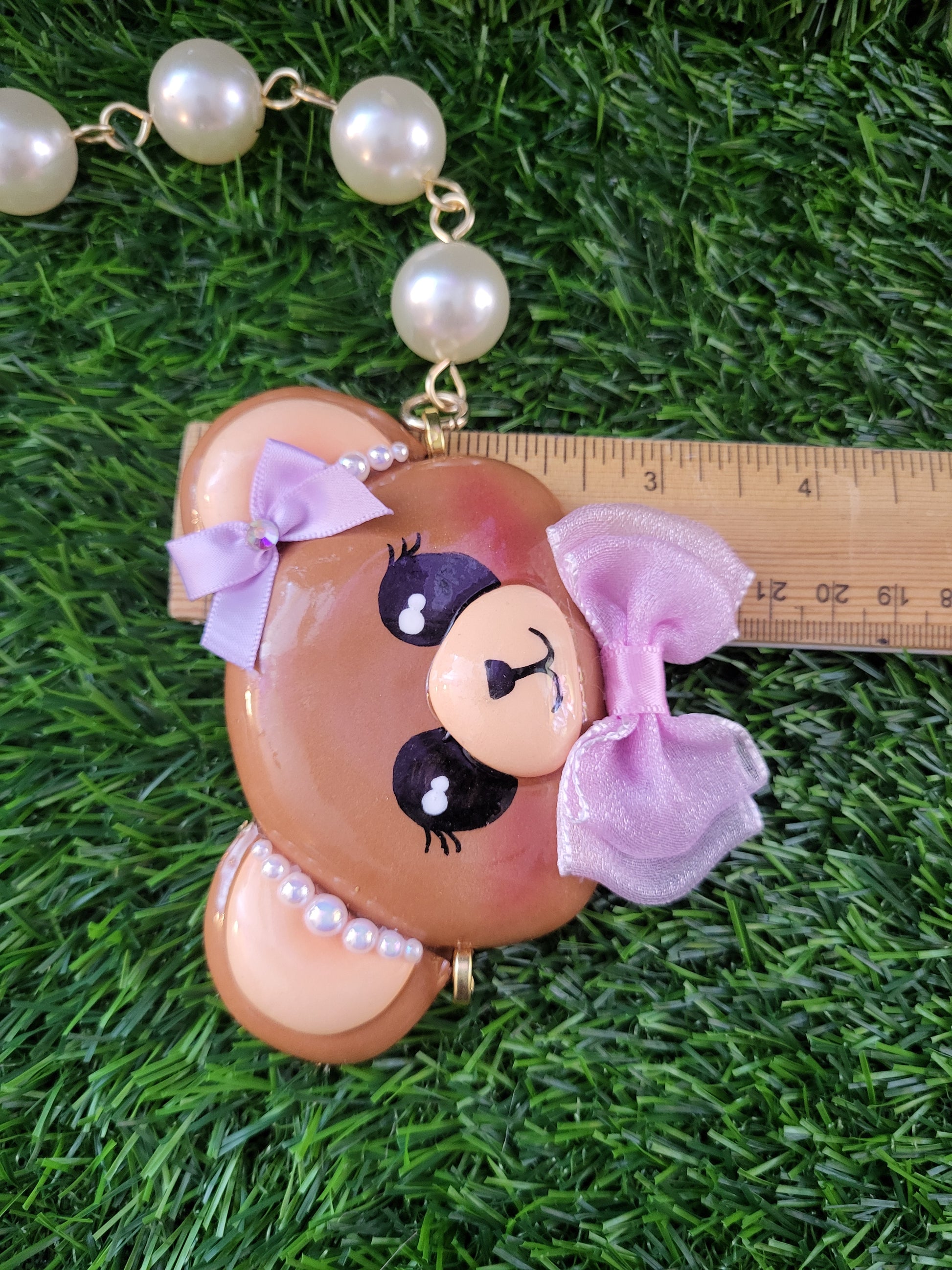 This adorable bear face charm is attached to a faux pearl gumball bead chain. A jumbo lobster clasp attaches to the side at the front for ease of access.