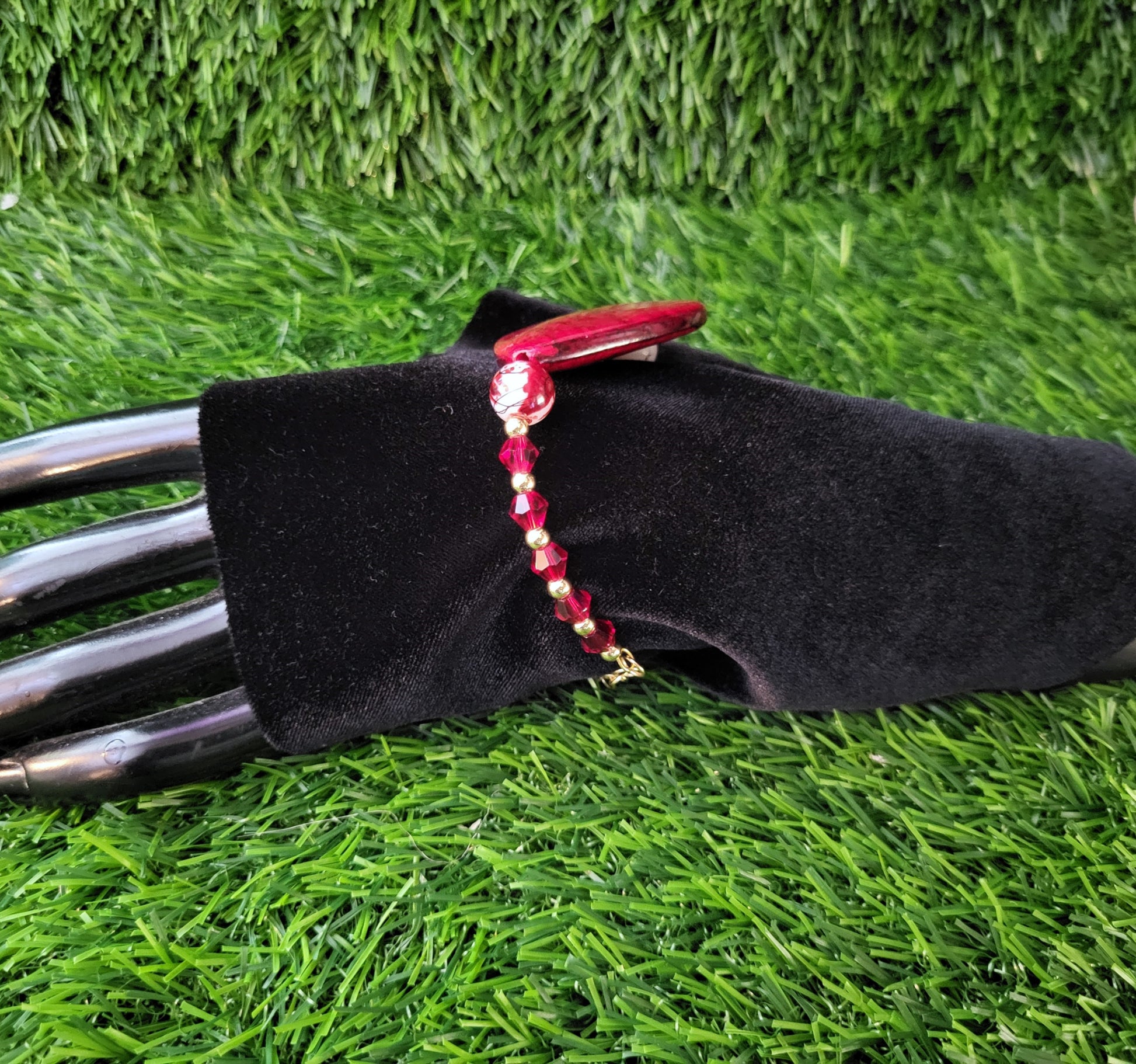 Bracelet closes with a lobster clasp and small length of chain ending in a single red teardrop bead.