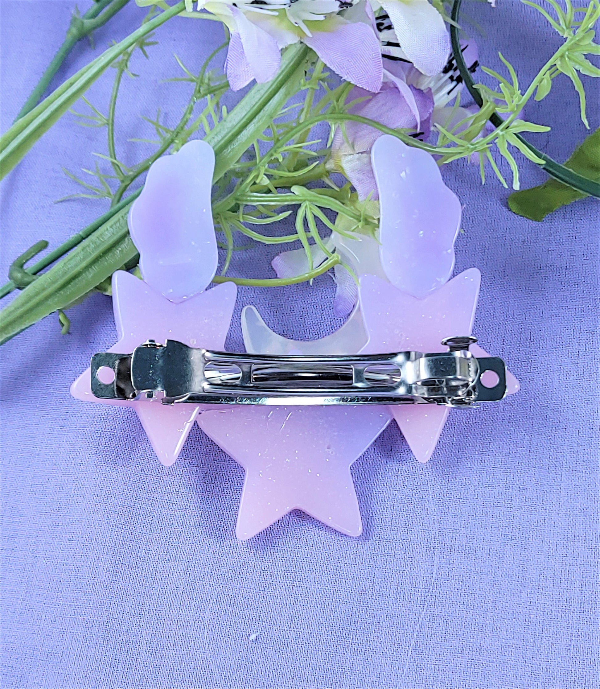 This barrette clip features three pastel ombre stars, a moon in one of 4 colors and wings. Hand placed faux pearls and rhinestones make each clip truly one of a kind.