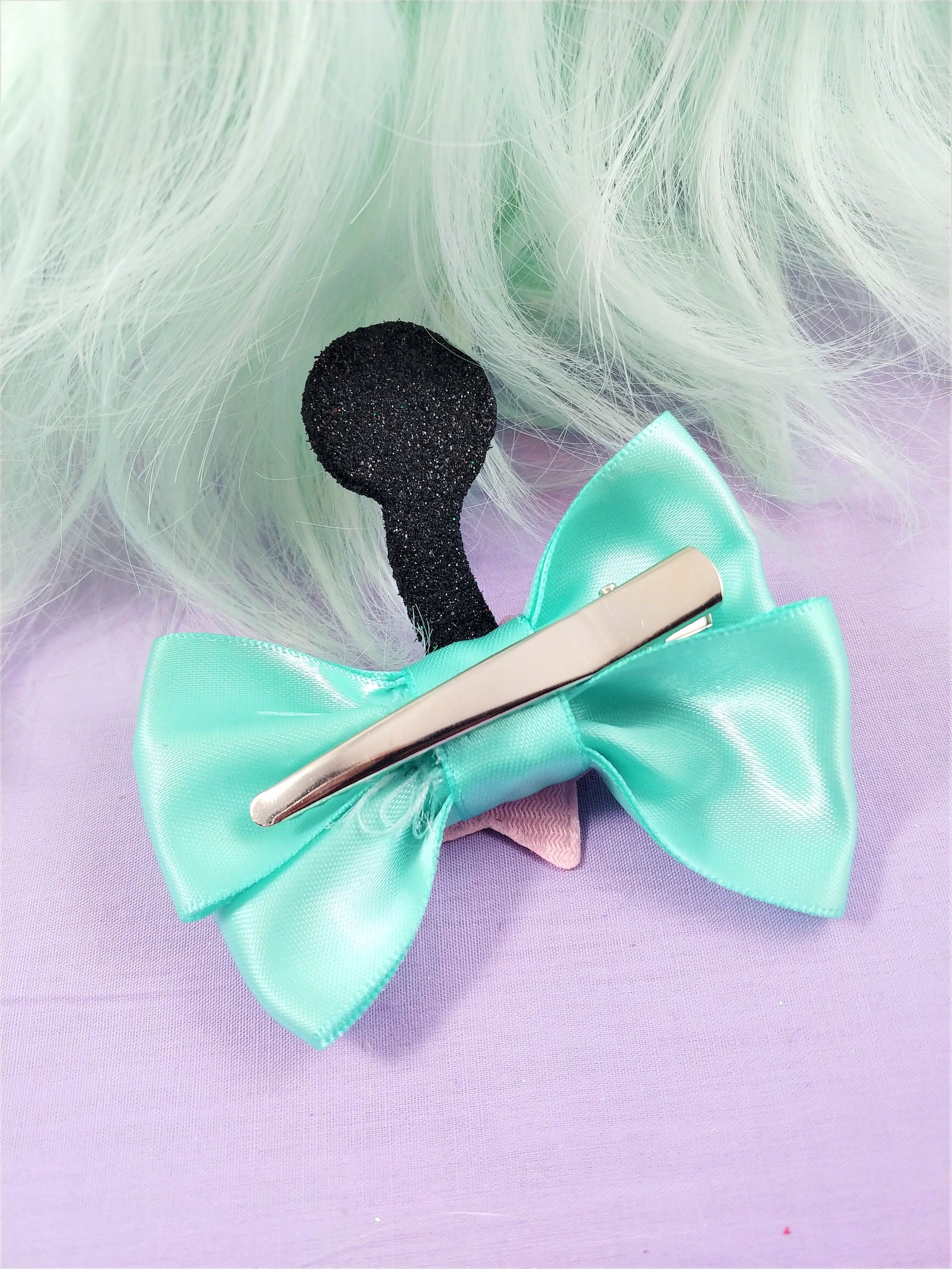 Each clip set comes with 2 pastel hair ribbons decorated with a pink glitter star and glitter antenna.