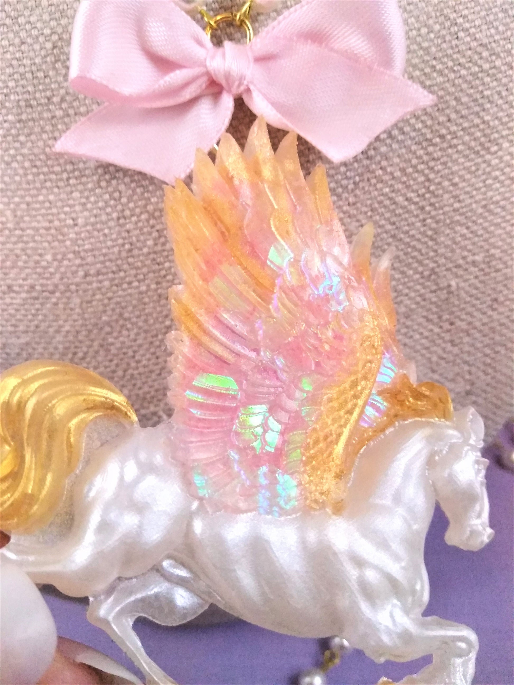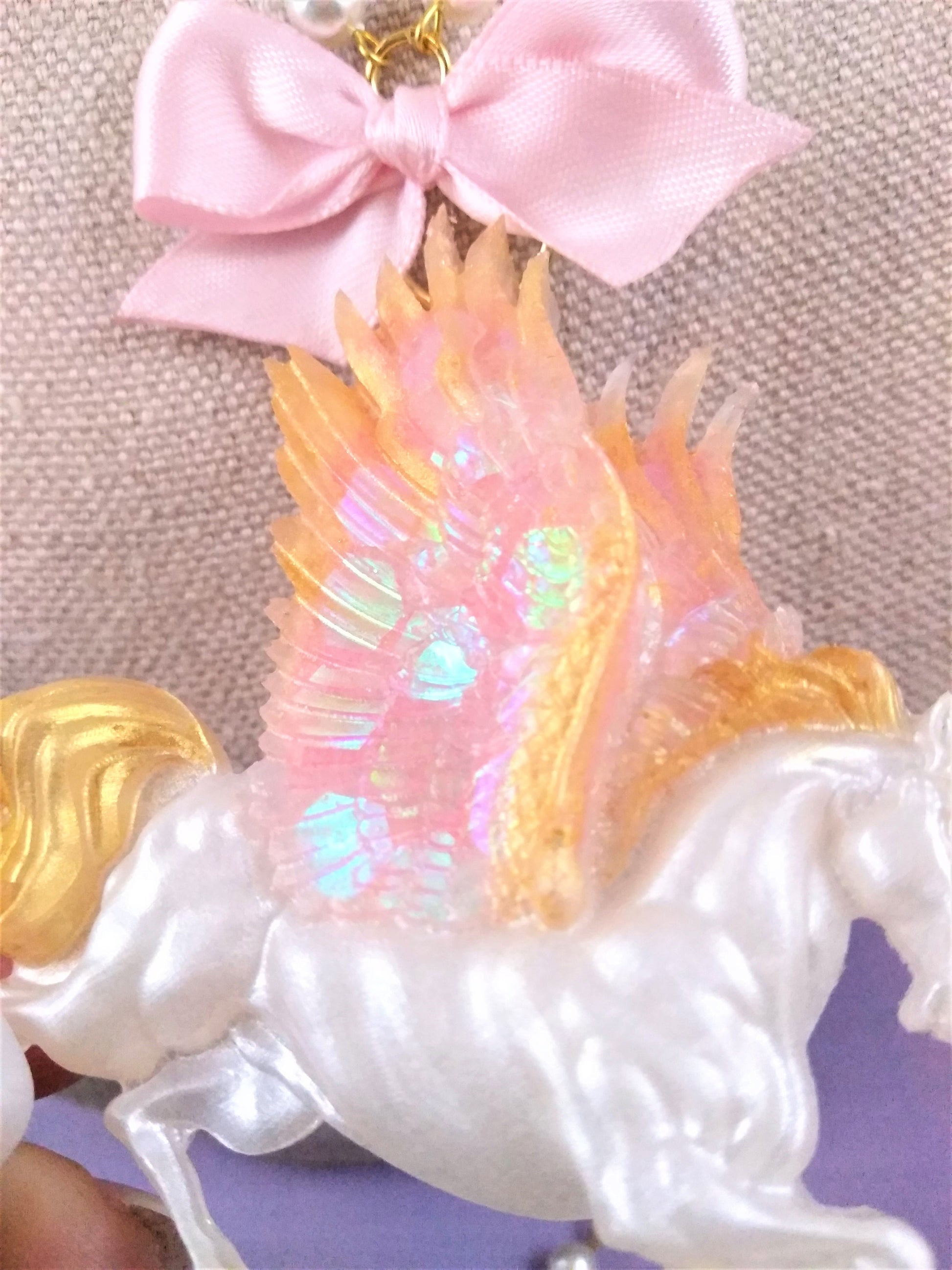 A delicate and precise process creates a beautiful winged horse pendant with iridescent wings that shift between shades of blue and green with pink hints in the light.