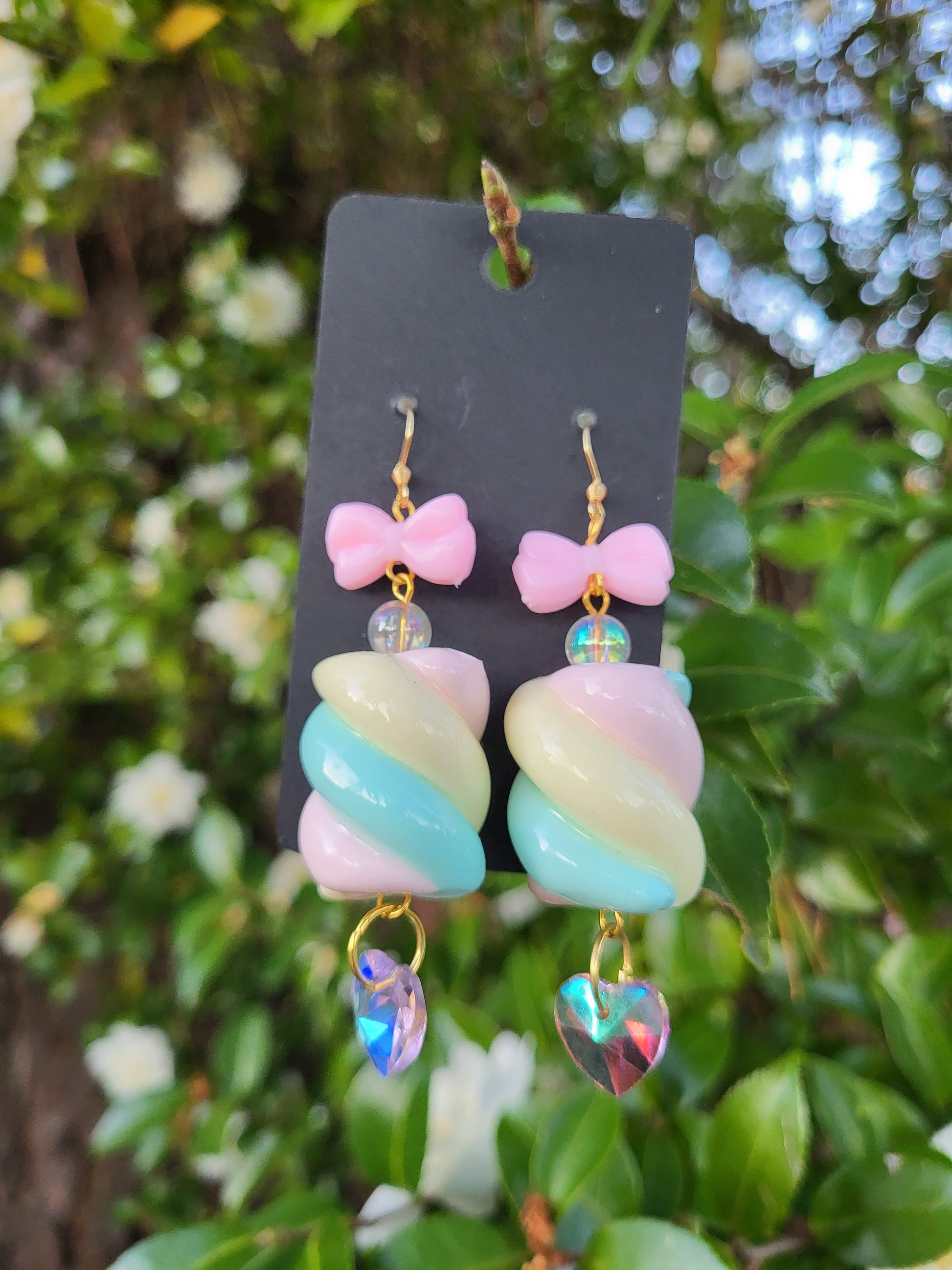Soft and sweet, these earrings have faux marshmallow twists with faceted heart beads and bows on top.