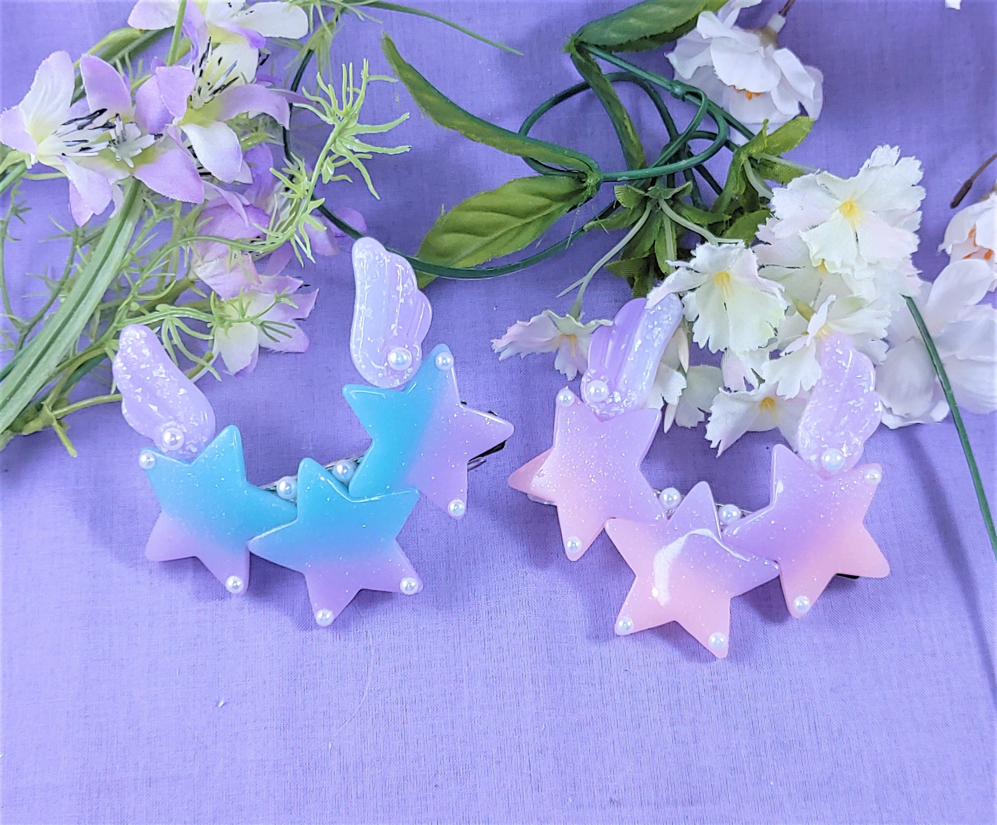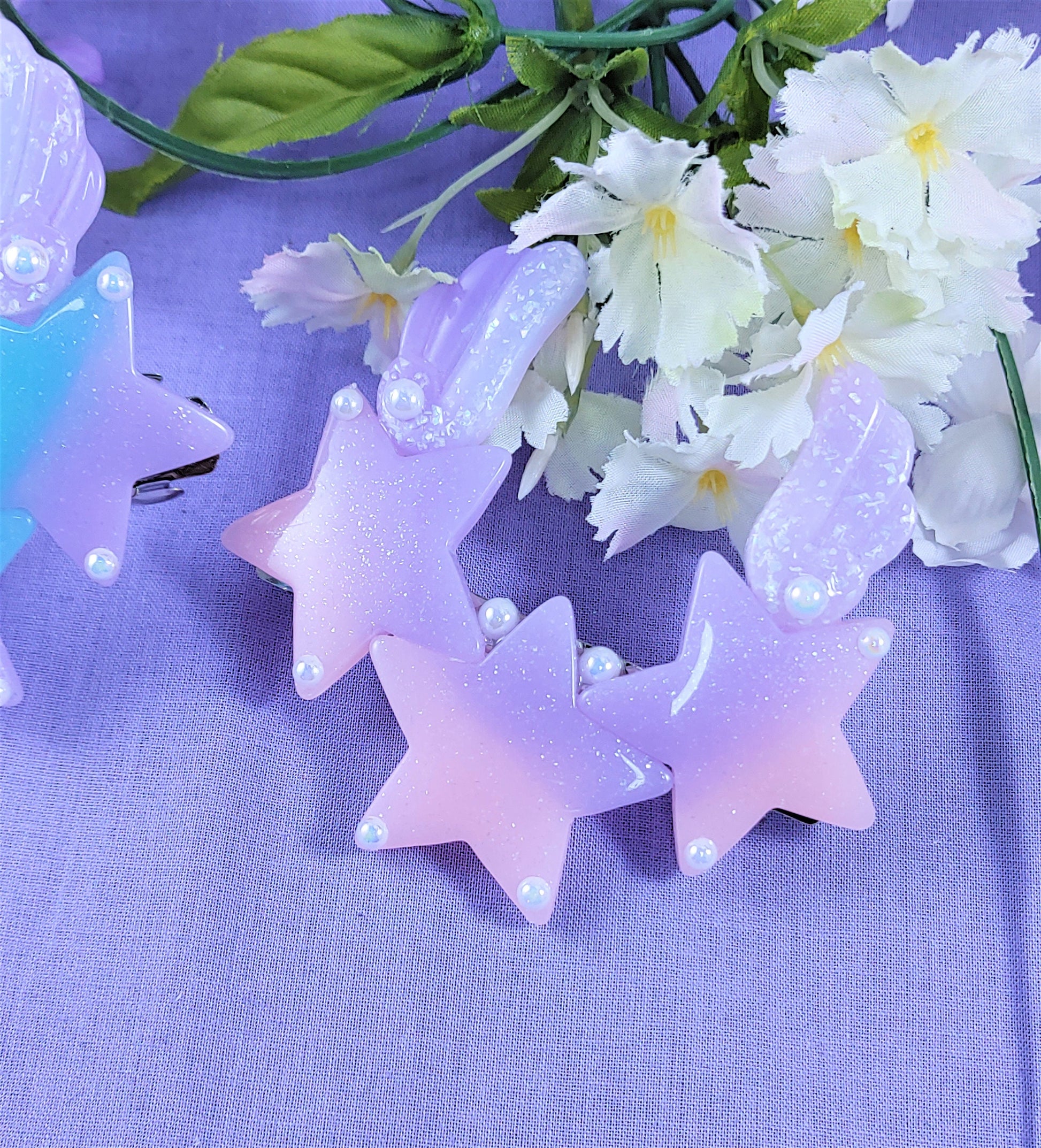 A simple mermaid inspired barrette, featuring 3 pastel ombre stars and a pair of wings all decorated with faux half pearls in various sizes.