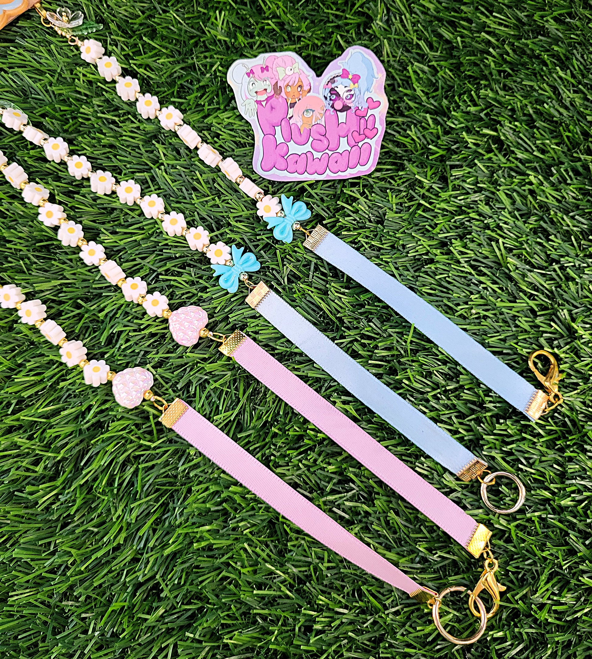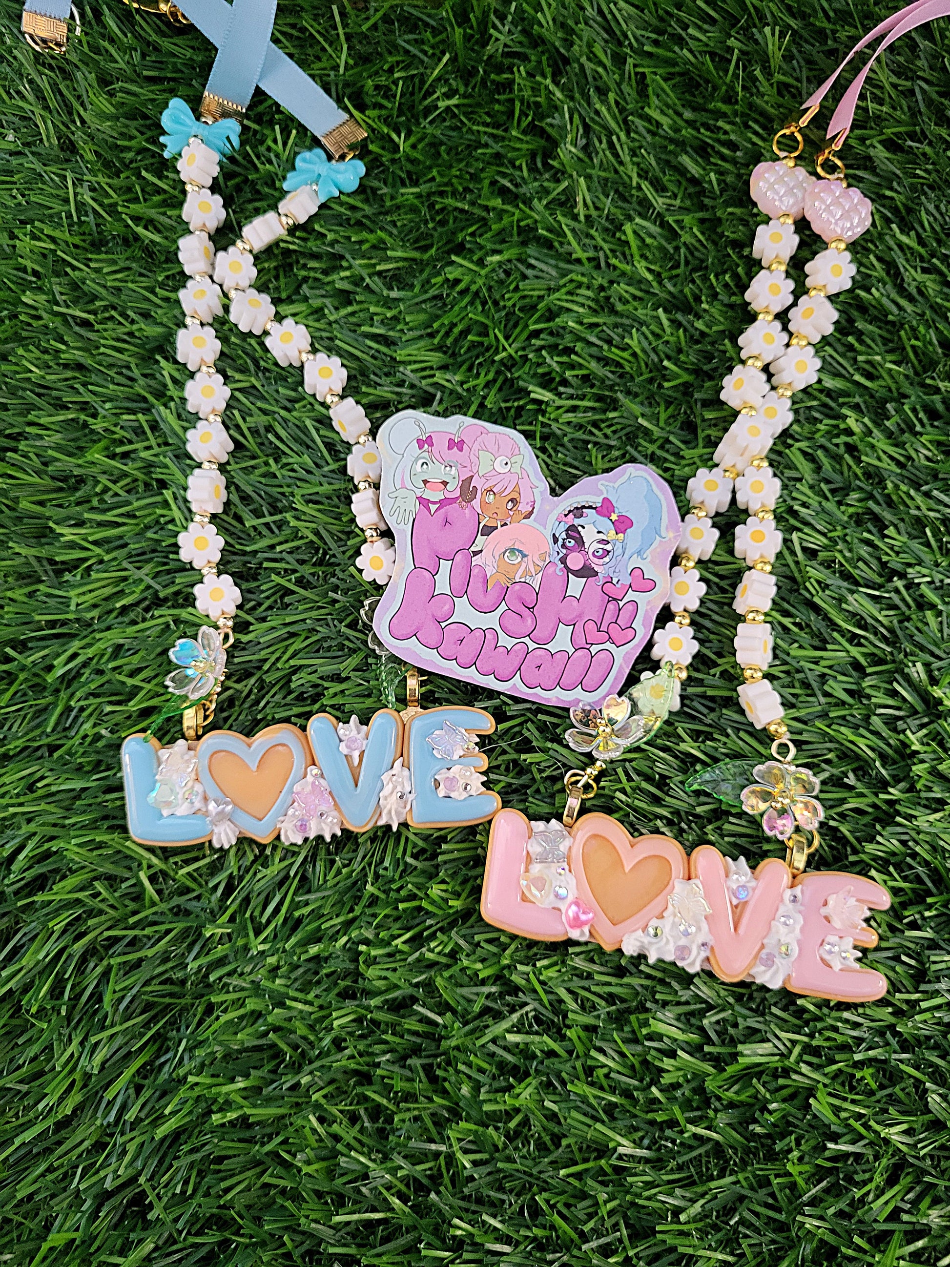 The whole display hangs from a hand strung daisy chain with iridescent flower details, matching bows or quilted heart beads and is finished with matching ribbon and a jumbo lobster clasp to close.