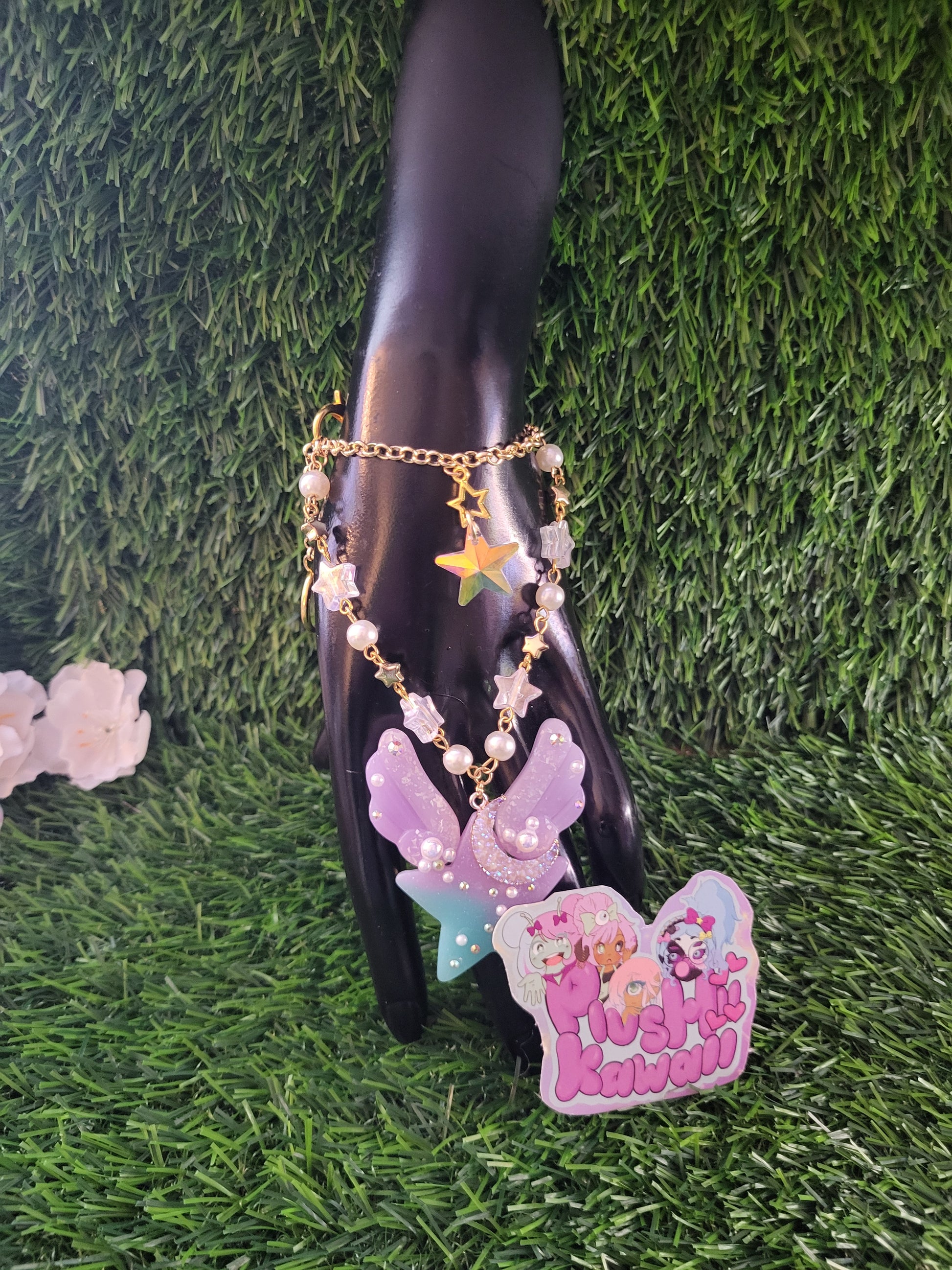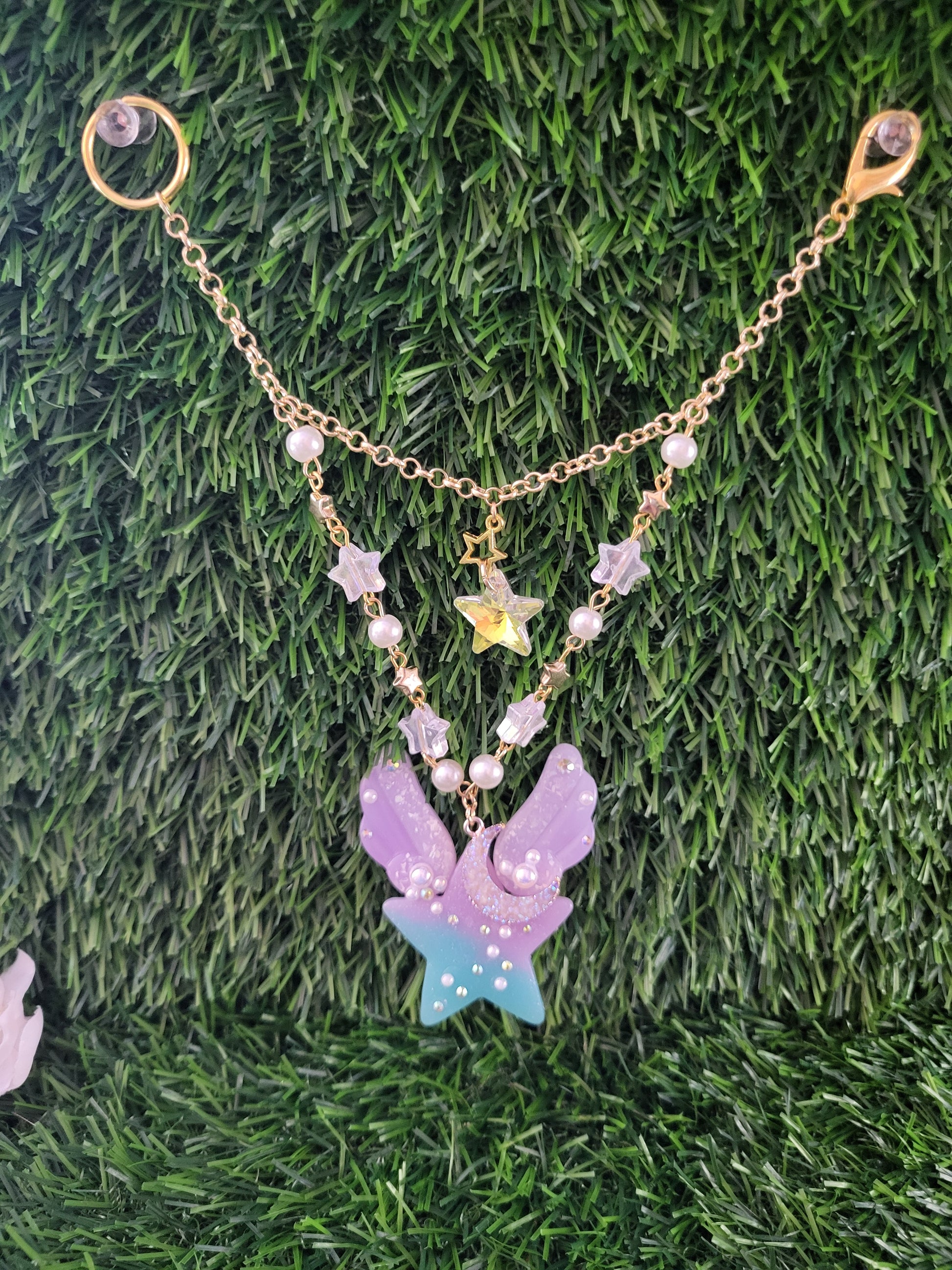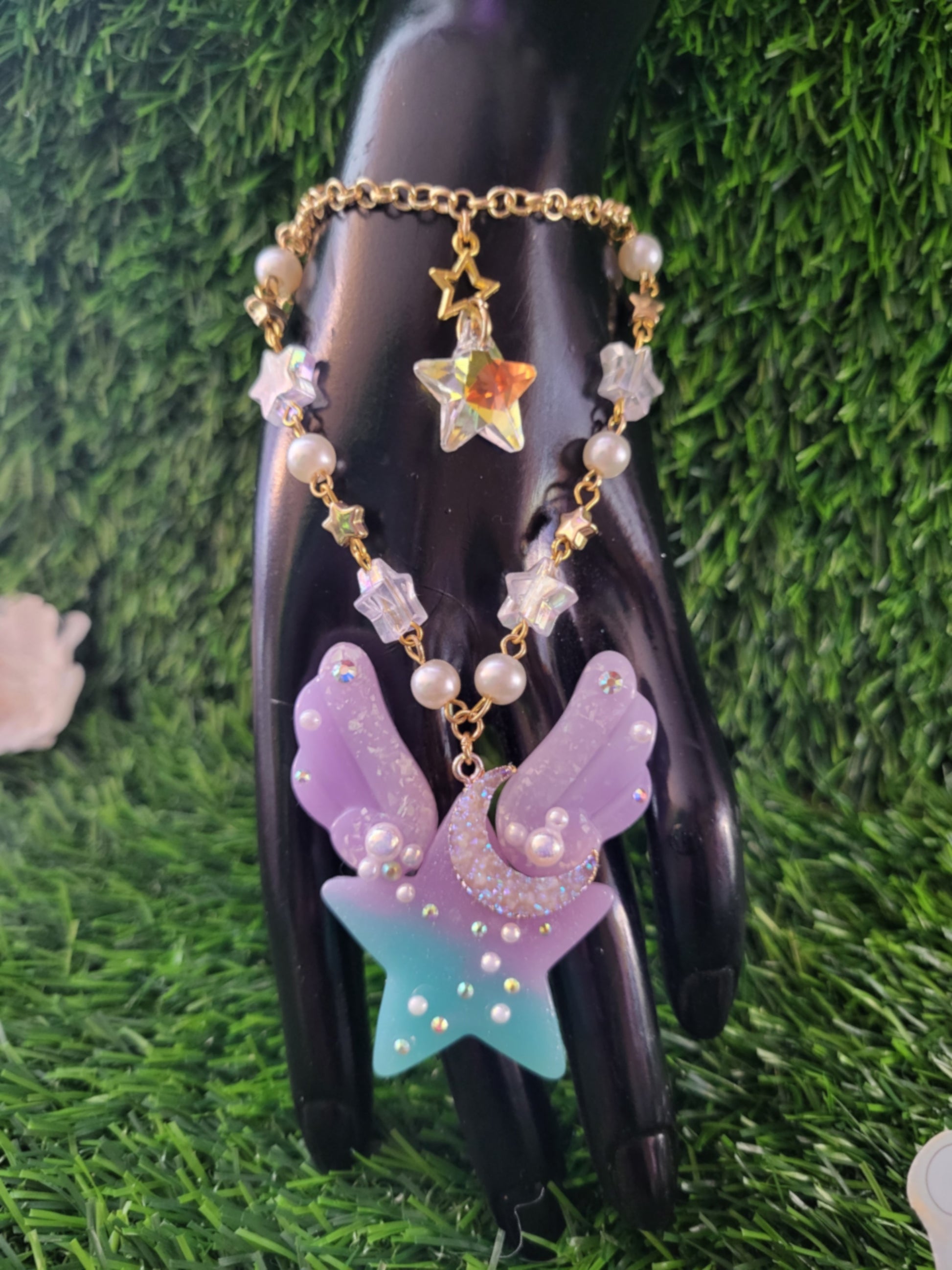 A winged star serves as the base for a twinkle of rhinestone stars and a druzy moon. A hand strung chain of faux pearls, gold stars and AB stars connects to a chain an dangles a faceted star. The whole thing closes with a giant lobster clasp.