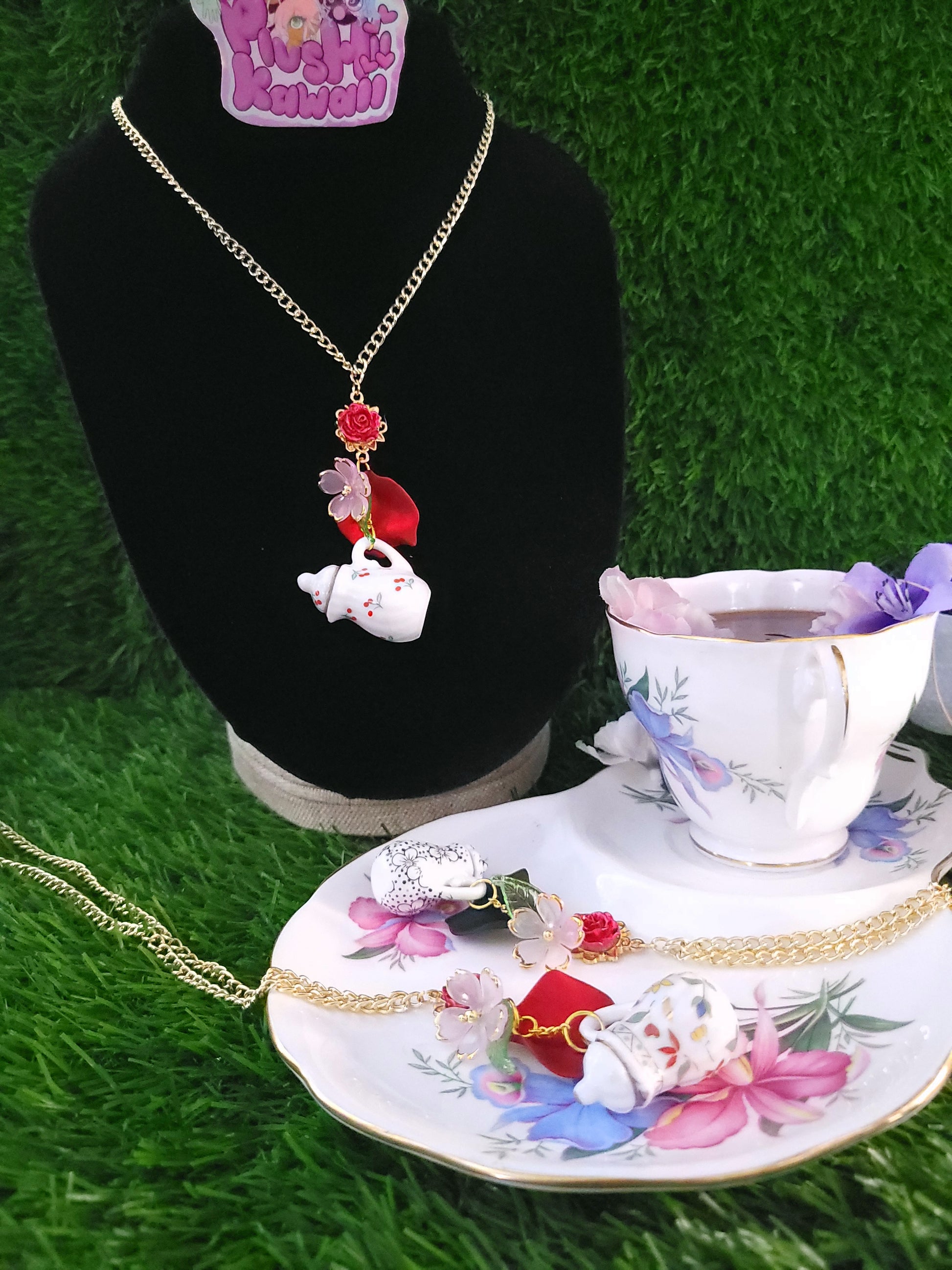 A simple, elegant necklace featuring a miniature teapot dangling from a rose cameo, backed by a velvety soft rose petal bead and decorated with a gold trimmed sakura flower bead. It is finished with a gold tone chain that closes with a jumbo lobster clasp.